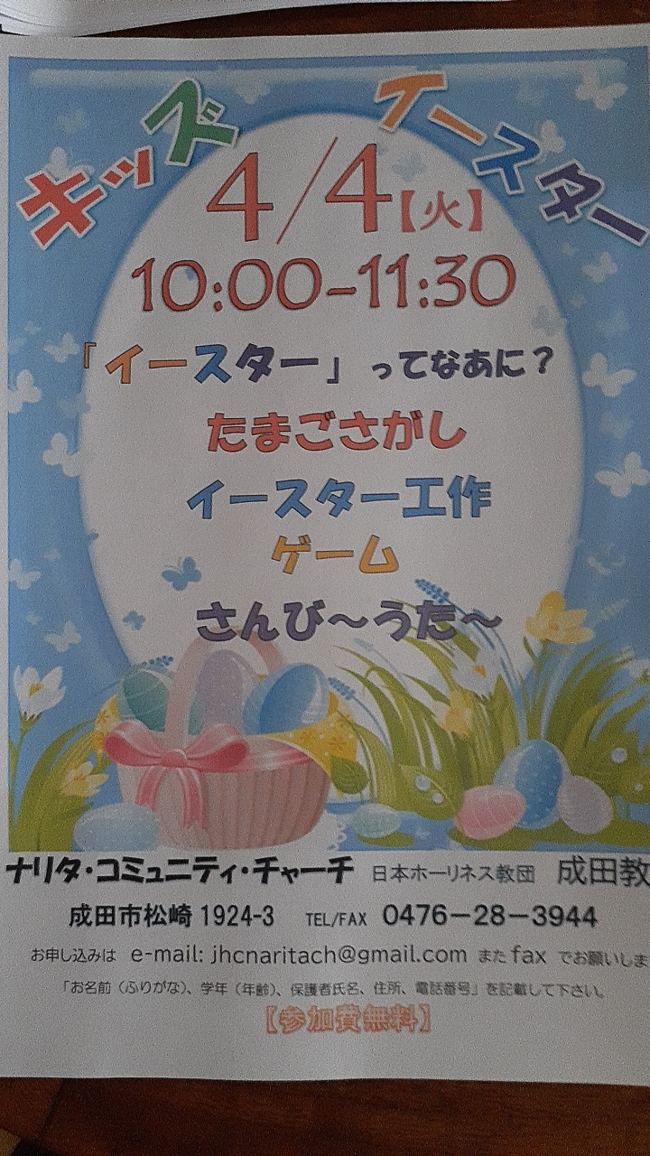 4月4日(火)am10:00~ 子どもとお母さんを対象にした『キッズ イースター』が開催されます。 ・賛美と聖書のおはなし ・イースターエッグさがし ・ゲーム ・プレゼント など楽しいプログラムを用意して、皆さまのお越しをお待ちしております。 初めての方でもお気軽にご参加ください。 お知らせ 2023年 〝イースター礼拝〟のお知らせ 2023年4月8日〝キッズイースター〟を開催しました 関連記事 2025年 12月24日(水)〝こども クリスマス会〟を開催します。 2025年11月8日 今年のクリスマスは 教会に来てみませんか? 2025年11月1日 10月26日(日)〝こども お楽しみ会〟を開催しました。 2025年10月31日 2025年 10月26日(日)〝こども お楽しみ会〟を開催します。 2025年10月20日 2025年9月21日(日) ウェルカム ファミリー礼拝を執り行います 2025年8月24日 2025年 夏季学校〝英語であそぼう〟開催のお知らせ 2025年6月29日 ハレルヤコーラス(G・Fヘンデル)の参加者を募集します。 2025年6月29日 2025年 6月22日(日)〝こども お楽しみ会〟を開催します。 2025年5月31日